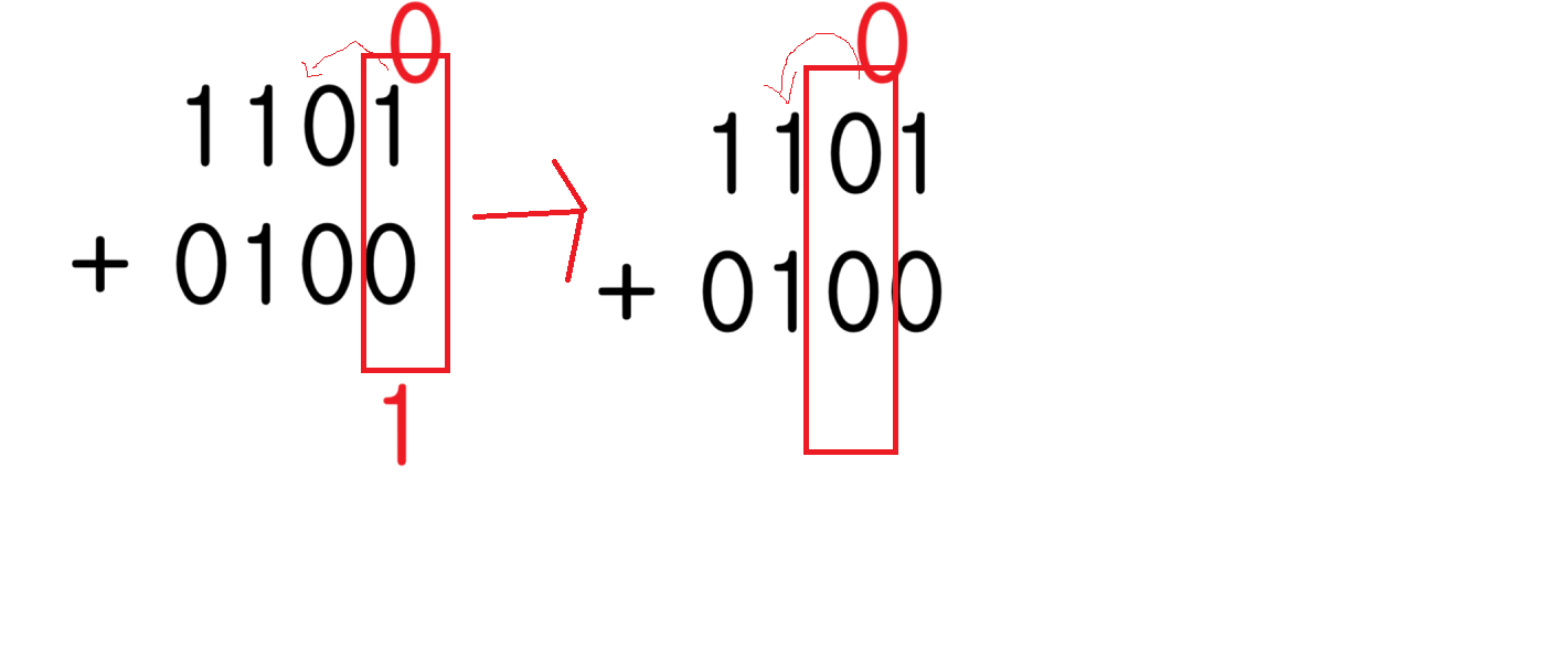 1번째로, 가장 아랫자리인 1과0 에서 먼저 계산이 끝나고, 캐리를 올립니다.