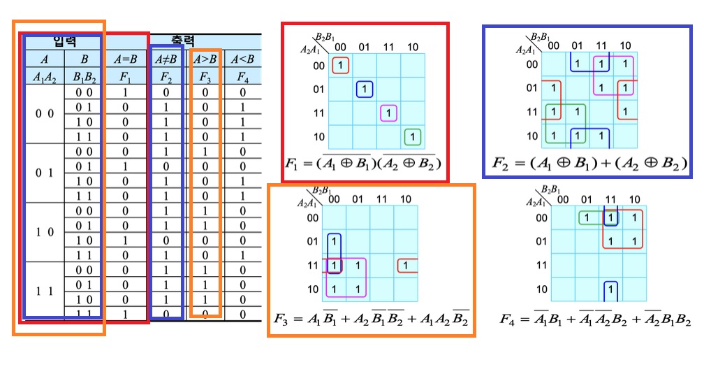 \(F1 = (\overline{A_{2}\oplus B_{2}})(\overline{A_{1}\oplus B_{1}})\) 로 정리가 됩니다.